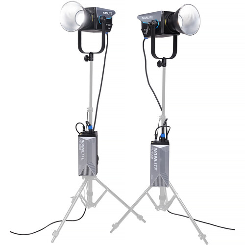 دو عدد نور Nanlite FC-500B بههمراه سافتباکس و کیف چرخدار، مناسب برای تولید فیلم، پخش تلویزیونی و ویدئو، با شدت نوردهی: 65,640 لوکس در فاصله 3.3 فوت (۱ متر) با رفلکتور، دمای رنگ قابل تنظیم (CCT) از 2700 تا 6500 کلوین، قابل استفاده با برق AC (شهری)، کنترل از طریق پنل روی دستگاه، بیسیم، DMX و اپلیکیشن، CRI 96 | TLCI 98 (دقت بسیار بالای بازتولید رنگ)، مجهز به سیستم خنککننده فندار، دارای مانت لوازم جانبی Bowens S، دارای دوازده افکت نوری ویژه (Special Effects)