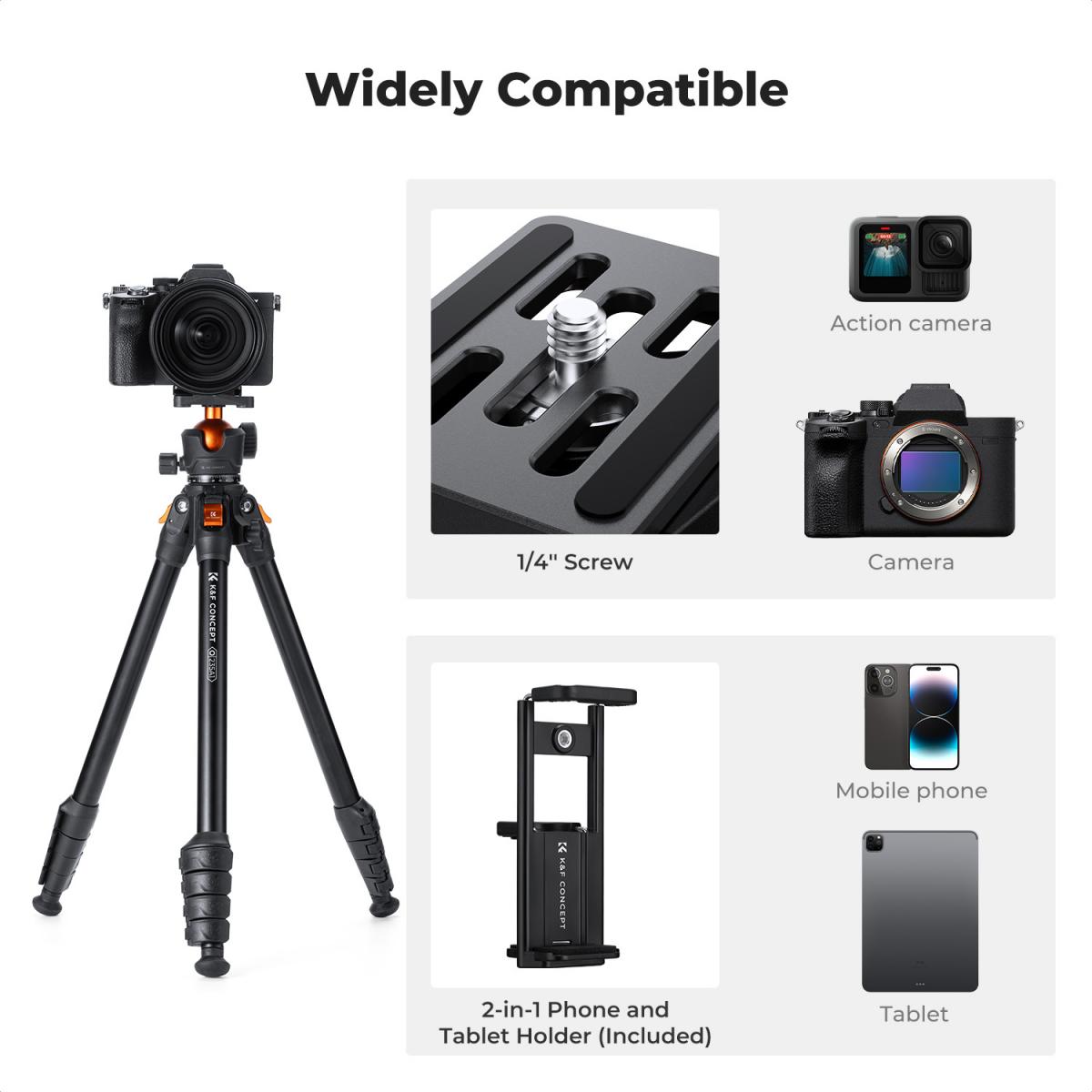 سه پایه عکاسی مسافرتی کی اند اف (KF09.161) با تحمل وزن تا 10 کیلوگرم، حداکثر ارتفاع تا 162.5 سانتی متر ، وزن 1.2 کیلوگرم ، ارتفاع جمع شده 48 سانتی متر ، به همراه هولدر نگه دارنده مو بایل و یا تبلت
