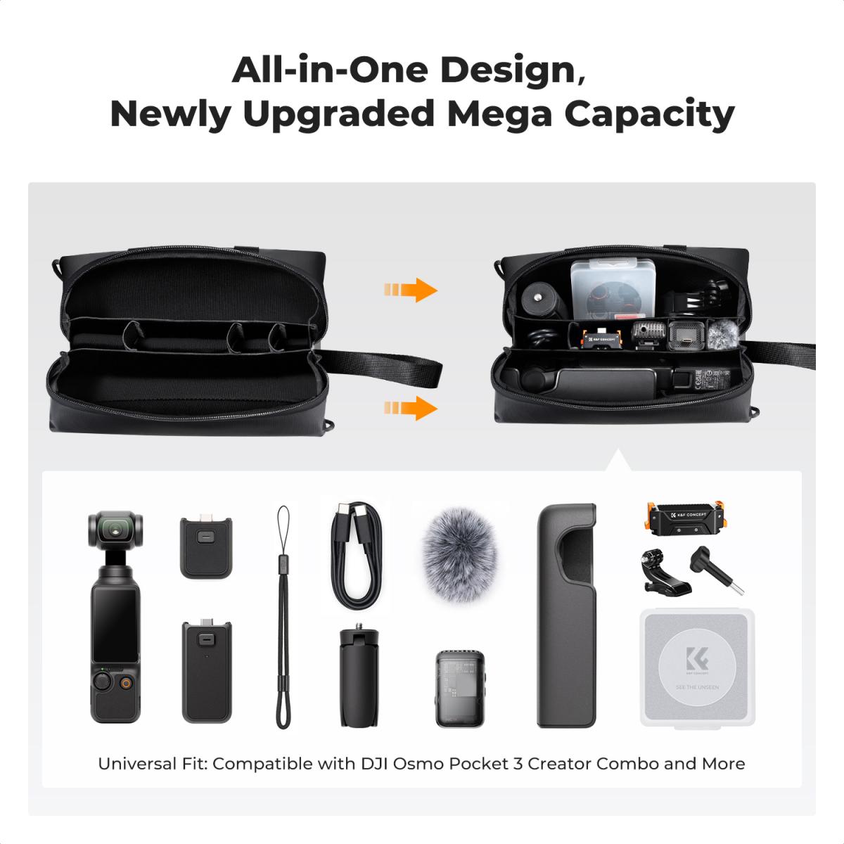 کاملاً متناسب با Pocket 3 طراحی شده و نیازی به جدا کردن دسته باتری یا دسته رزوهدار ندارد. دارای بخشبندی مجزا برای نگهداری کیت کامل، جعبه فیلتر K&F و امکان قرار دادن لوازم جانبی بیشتر.